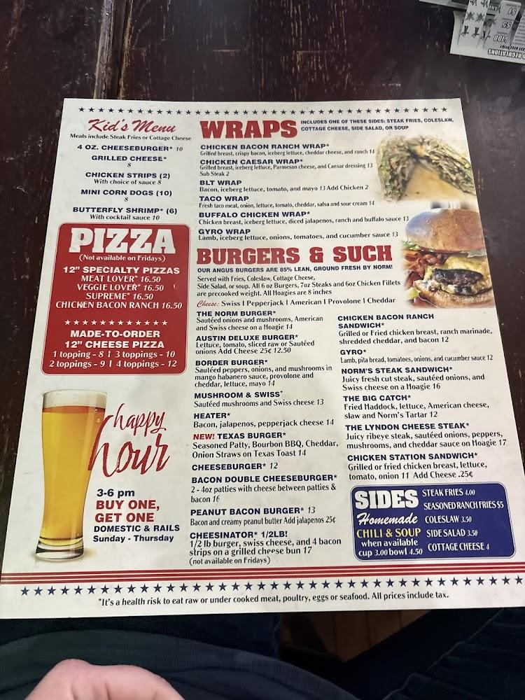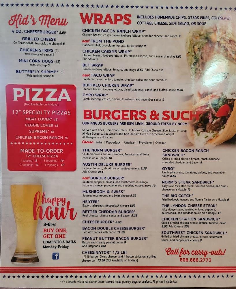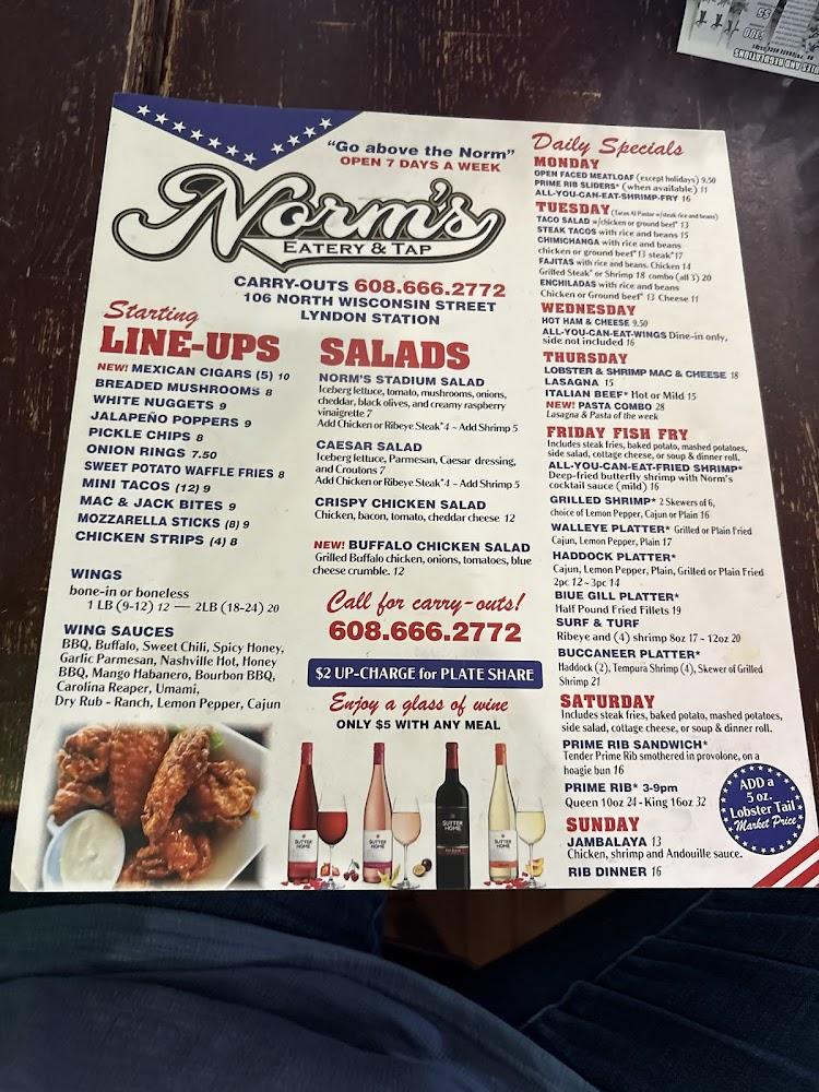 Welcome to Norm's Eatery & Tap, your go-to destination in Lyndon Station for a delicious dining experience. Located at 106 N Wisconsin St, we offer a relaxed and vibrant atmosphere perfect for breakfast, lunch, or dinner. Enjoy our extensive menu featuring local specialties, craft cocktails, and a wide selection of beers. Join us for live music and happy hour specials that make your visit even more enjoyable. With accessible seating and facilities, we warmly welcome everyone. Whether you're dining solo or with a group, Norm's is the ideal spot to unwind and indulge in good food and great company.